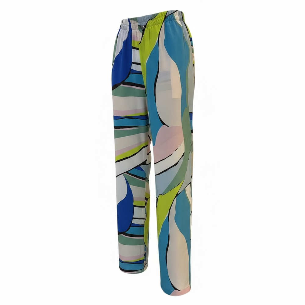 Calça reta em 100% seda, com elástico na cintura frente e costas.