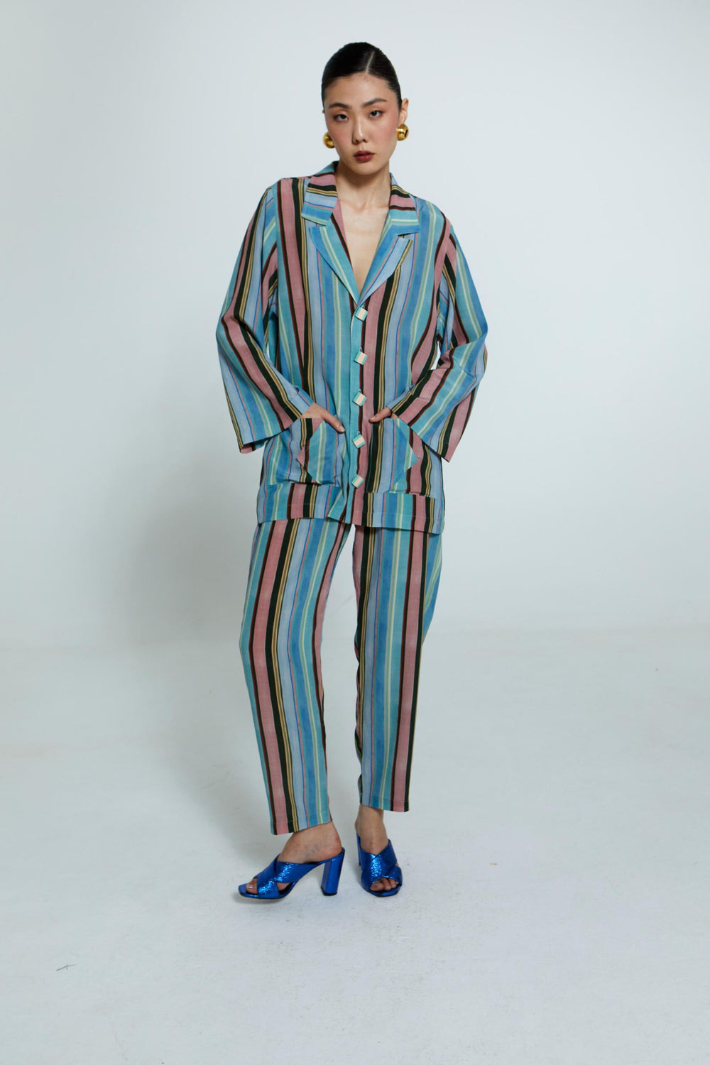 Calça feminina listrada multicolorida, em seda 100%, com modelagem reta e cós elástico