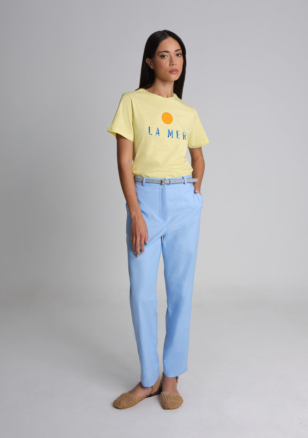 A Camiseta La Mer traduz o espírito solar em uma peça casual de impacto sutil. Em 100% algodão silkada , traz estampa frontal silkada em azul e laranja sobre fundo amarelo ou branco, unindo leveza e personalidade. Use com jeans, alfaiataria clara ou saias fluídas para looks descomplicados. Cores: Amarelo com estampa azul e laranja, Branco com estampa azul e laranja Composição: 100% Algodão Medidas da Modelo: Altura: 1,71 m / Busto: 83 cm / Cintura: 60 cm / Quadril: 90 cm. A modelo veste tamanho PP  |