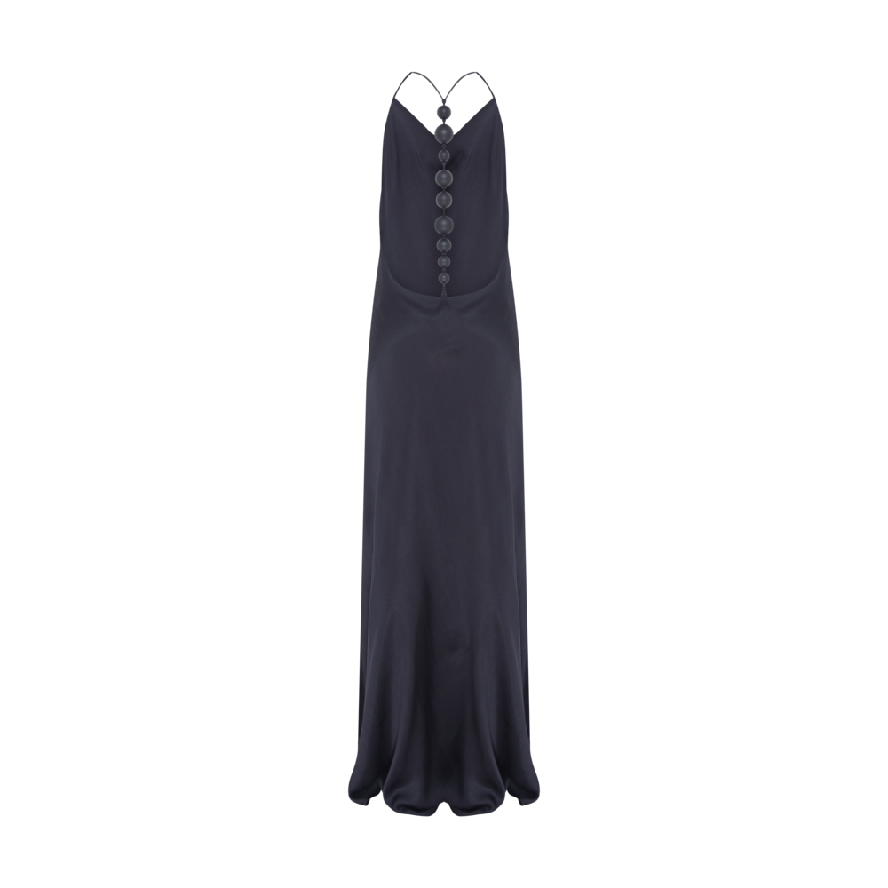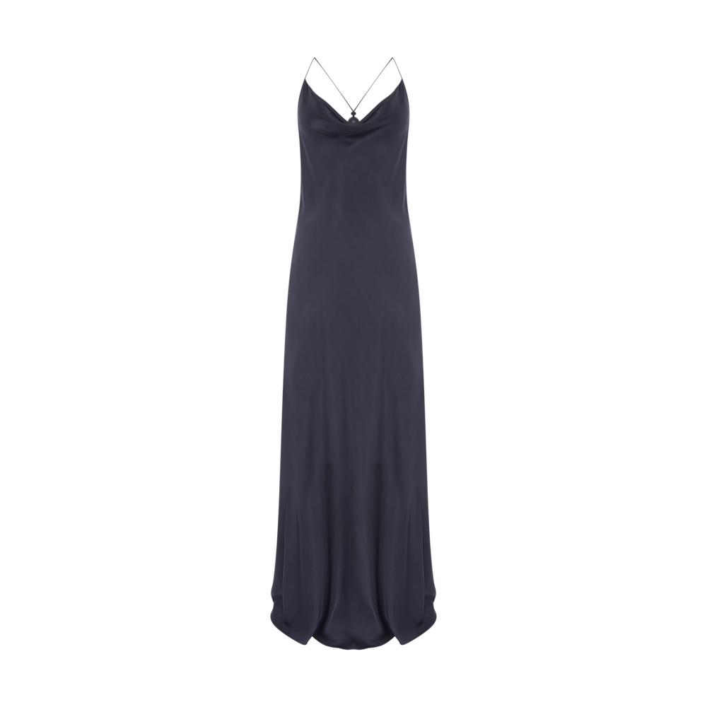 Vestido Luna longo em seda marrom com costas abertas e caimento fluido.