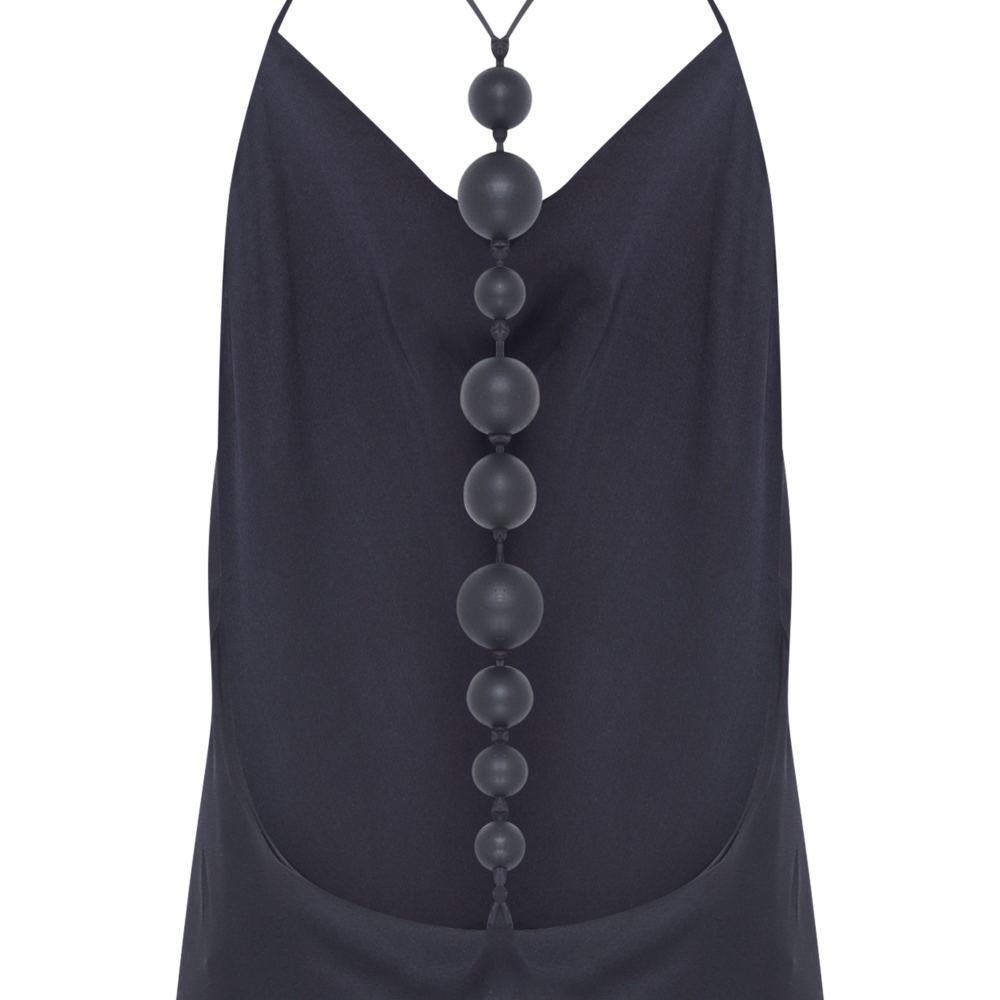 Vestido de seda marrom com alças de madeira, costas abertas e modelagem longa.